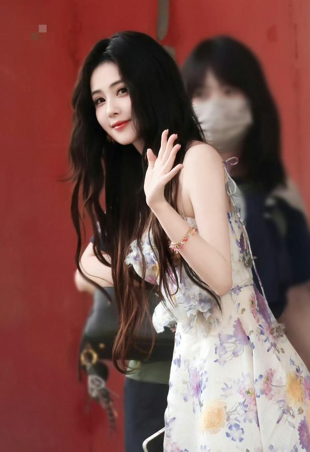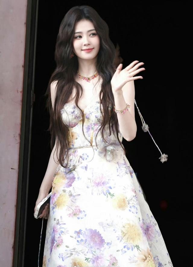 白鹿跑男路透,身穿紫色碎花裙,披散如海藻般长发,化身花仙子