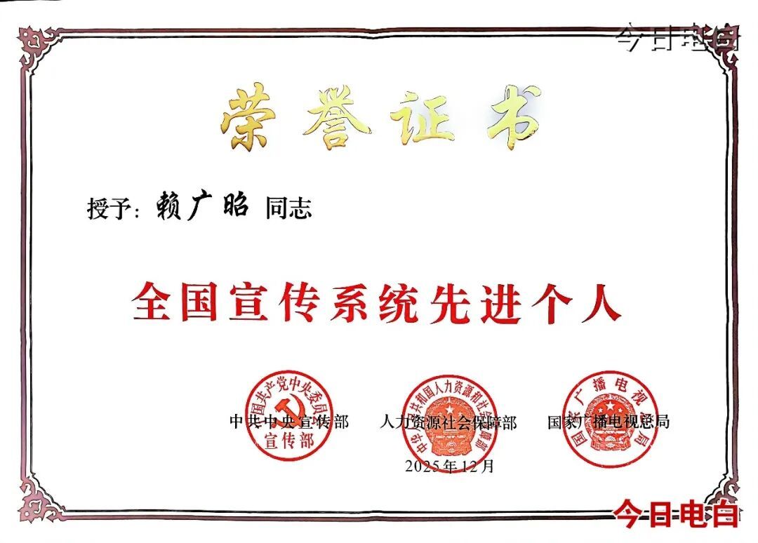 2025年12月20日,全国宣传系统先进集体和先进个人表彰大会在京召开,电白区新闻中心副主任赖广昭获评“全国宣传系统先进个人”,成为全市唯一获此国家级荣誉的个人。这份认可,既是对个人工作的肯定,更是电白区新闻中心坚持党建引领、深耕宣传主业的生动体现。
